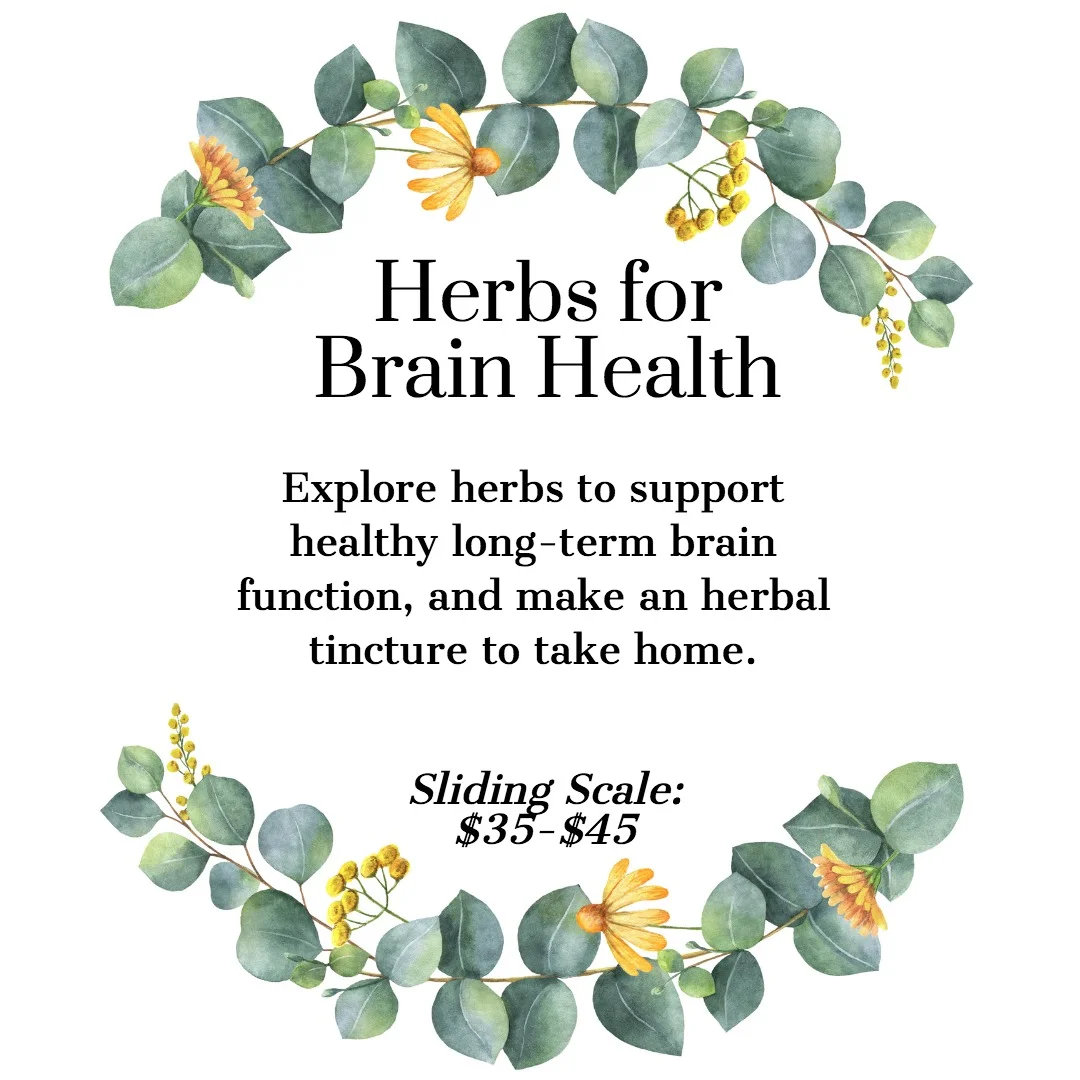 In this class we will explore herbs that can support long-term brain function. We will discuss cerebral circulation, mental clarity and focus, and memory. We will also explore headaches: what they are, potential causes, and holistic and herbal options. We will learn about herbal tinctures and you will make your own tincture to take home.